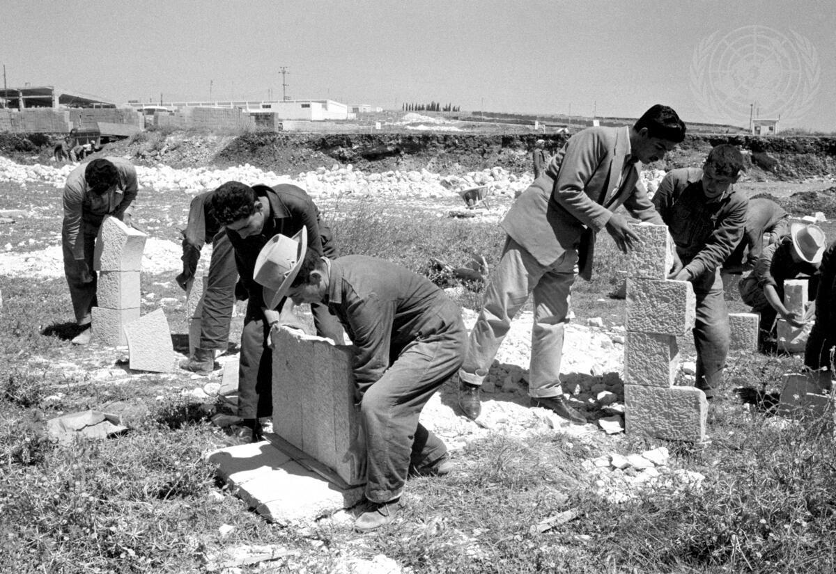 Trainees of the UNRWA Vocational Training Centre at Wadi Seer are seen here learning the art of house building. UNRWA's efforts to assist Palestine refugees to become self-supporting are focused on vocational training. By 1963 the Agency hopes to graduate 2,500 students annually in over 20 trade and professional courses.