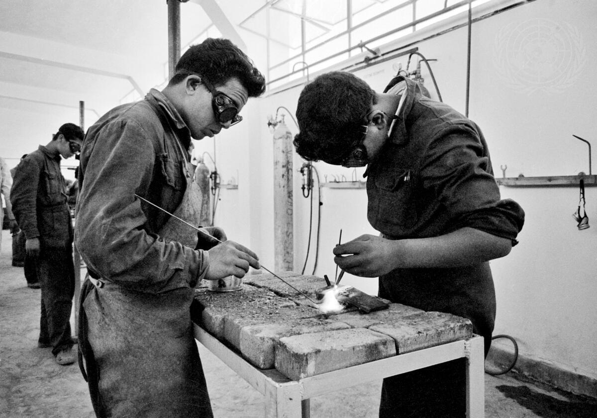 Trainees at the welding workshop of the UNRWA Vocational Training Centre at Wadi Seer in Jordan. UNRWA's efforts to assist Palestine refugees to become self-supporting are focused on vocational training. By 1963 the Agency hopes to graduate 2,500 students annually in over 20 trade and professional courses. [Exact date unknown]
