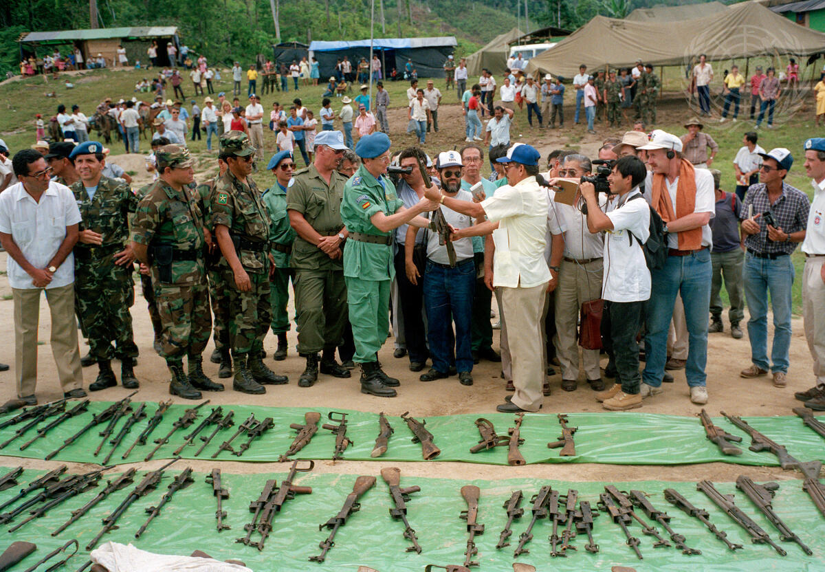 General Augustin Quesada Gomez (Spain), Commander of the United Nations Observer Group in Central America (ONUCA) (wearing a blue beret), inspects a weapon surrendered by the Nicaraguan resistance forces as part of the overall peace process in Central America.