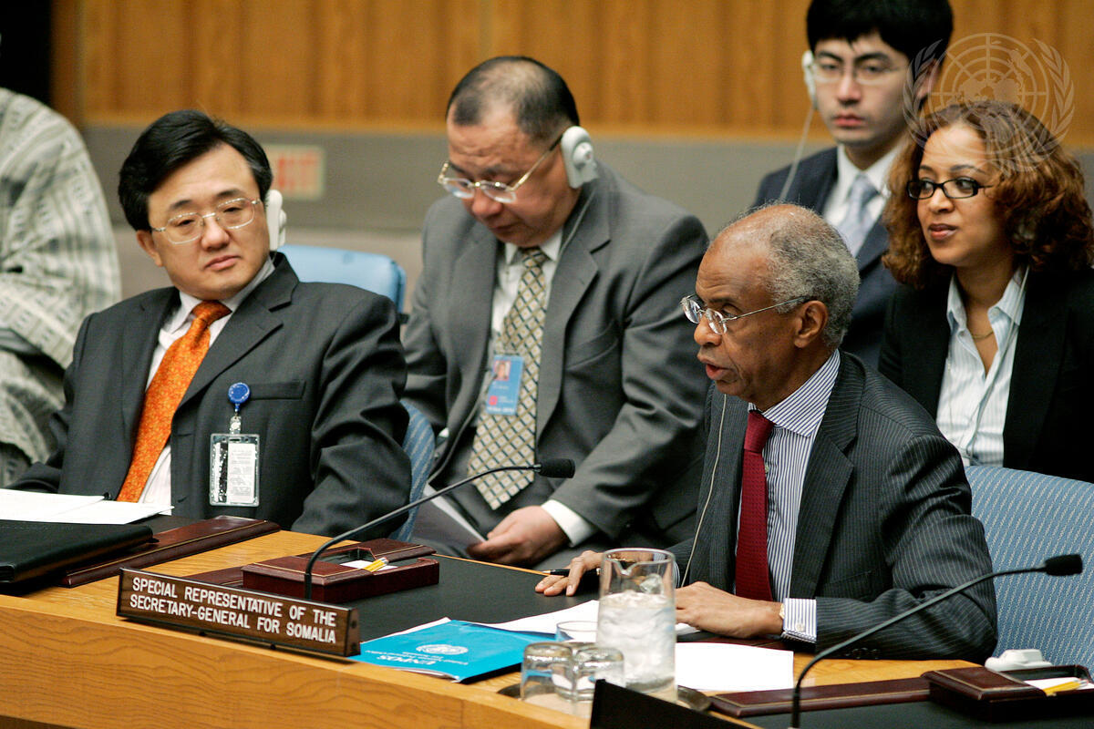 Ahmedou Ould-Abdallah (third from right), Special Representative of the Secretary-General for Somalia, addresses the Security Council on the situation in the country.