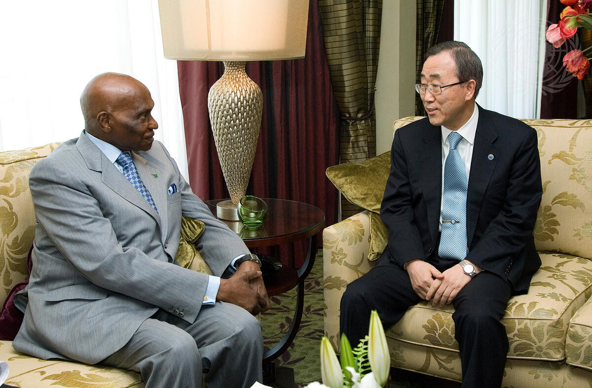 Secretary-General Ban Ki-moon (right) holds a bilateral meeting with Abdoulaye Wade, President of the Republic of Senegal.