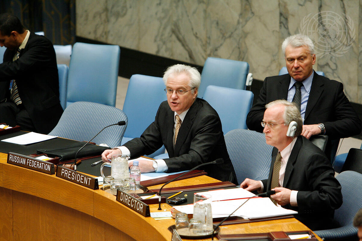 Vitaly Churkin (third from right), Permanent Representative of the Russian Federation and President of the Security Council for March, presides over a meeting considering the repot of the Secretary-General on the deployment of the African Union-United Nations (AU/UN) Hybrid Operation in Darfur.