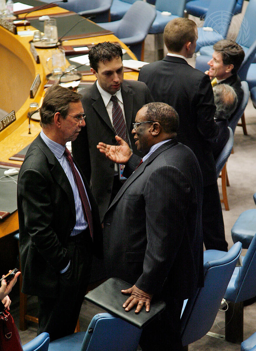 Dumisani S. Kumalo (right), Permanent Representative of the Republic of South Africa to the United Nations, Johan Verbeke (left), Permanent Representative of Belgium to the United Nations, and Olivier Belle (centre), Deputy Permanent Representative of Belgium to the United Nations, in conversation prior to the Security Council meeting on the report of the Secretary-General on the deployment of the African Union/United Nations Mission in Darfur (UNAMID).