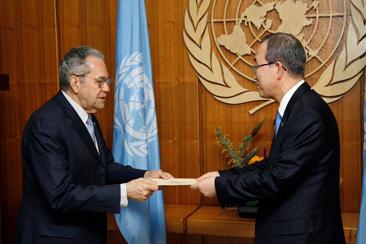 Jorge Arturo Reina Idiaquez (left), new Permanent Representative of Honduras to the United Nations, presents his credentials to United Nations Secretary-General Ban Ki-moon.