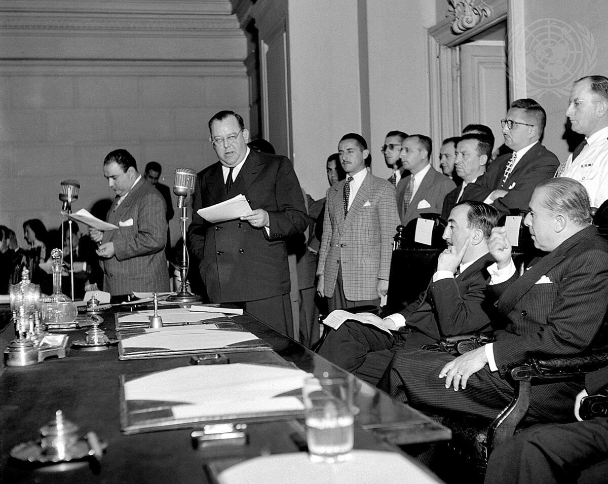 The twelfth session of the United Nations Economic and Social Council began on 20 February in Santiago, Chile, by an inaugural reception held in the Ceremonial Hall of the Congress of Chile. This picture shows Mr. Trygve Lie, United Nations Secretary General, addressing the delegates, and (seated, left to right) Ambassador Hernan Santa Cruz, Chairman of the Economic and Social Council, and Dr. Gabriel Gonzalez Videla, President of Chile.