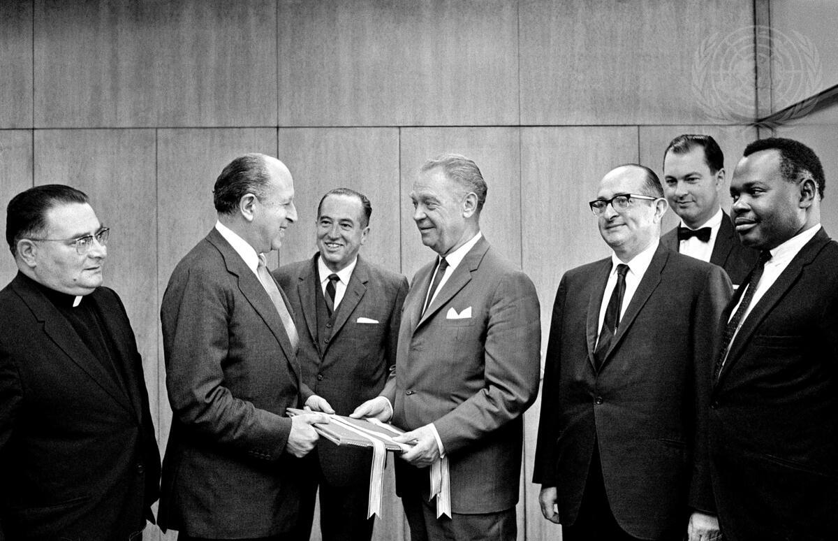 Foreign Minister of Sweden, Torsten Nilsson (centre right) deposits the instrument of ratification of the Protocol on Status of Refugees with Constantin Stavropoulos, UN Legal Counsel (centre left), in the office of the latter. At left, is Monsignor Alberto Giovannetti, Permanent Observer to the UN from the Holy See; at right, Marc Schreiber, Director, UN Division of Human Rights, and Capitaine Gilbert Bandio, First Secretary of the Permanent Mission of the Central African Republic to the UN.