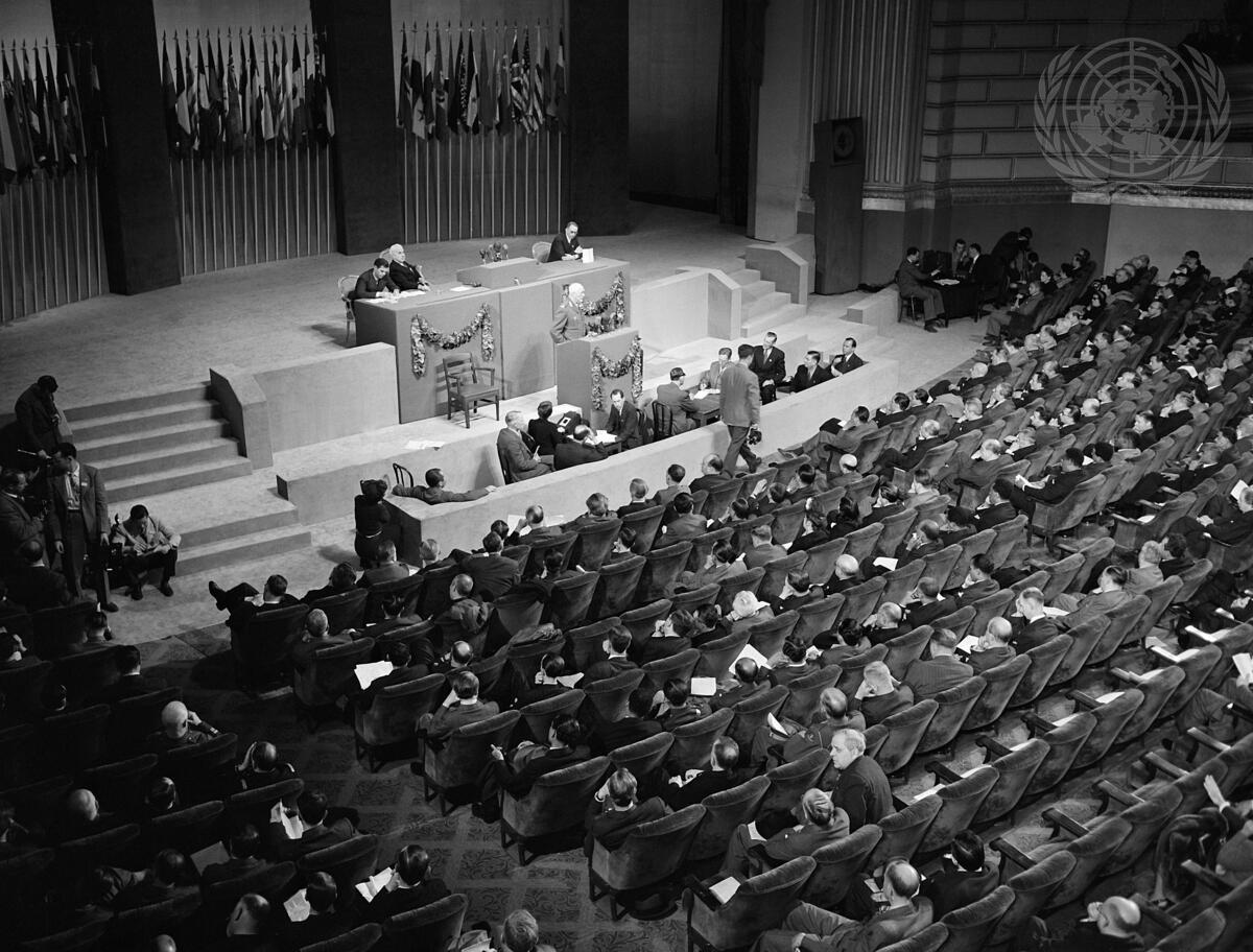 Field Marshall Jan Christian Smuts, Prime Minister, Chairman of the delegation from the Union of South Africa, addresses the Conference at the Sixth Plenary Session, 1 May 1945.