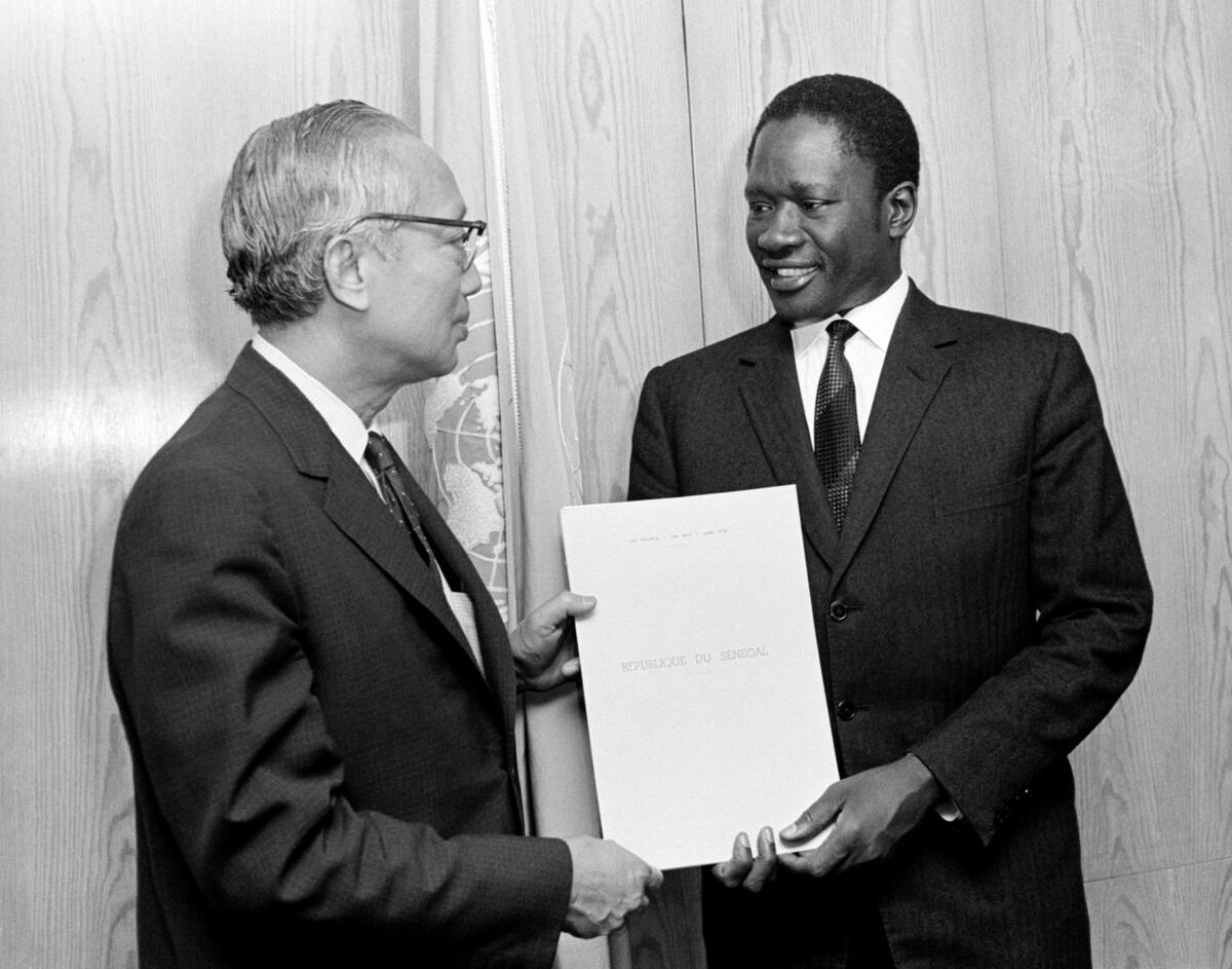 Medoune Fall (right), the new Permanent Representative of Senegal, is seen presenting his credentials to Secretary-General U Thant at United Nations Headquarters today.
