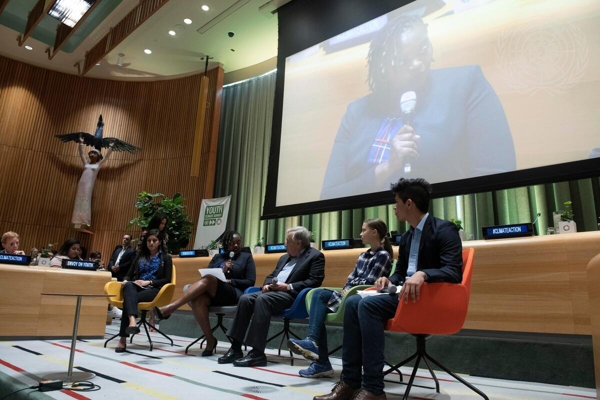 From left to right are: Komal Karishma Kumar, Climate Activist; Ms. Njoroge; Secretary-General António Guterres ; Greta Thunberg, Climate Activist; and Bruno Rodriguez, Climate Activist."