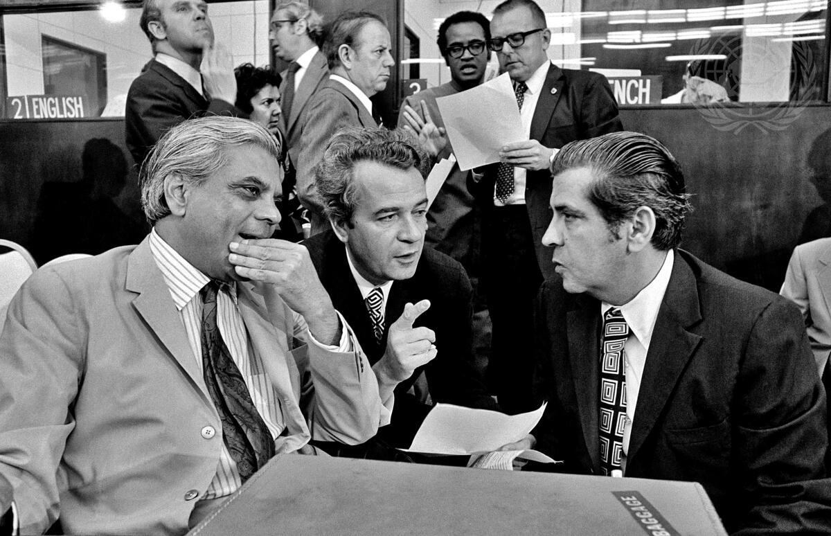Discussing a document, before the meeting began, are (l. to r.): Samar Sen (India), Lazar Mojsov (Yugoslavia) and Aquilino E. Boyd (Panama), President of the Council.