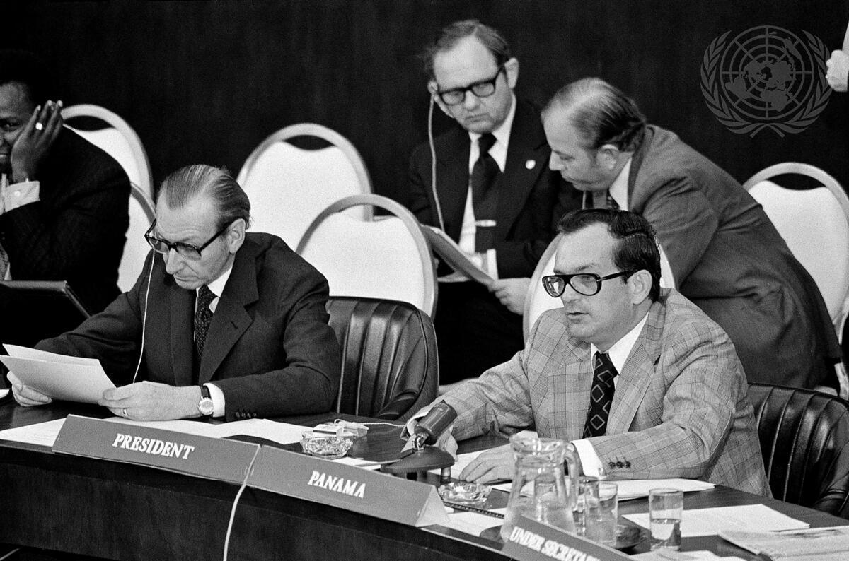 Juan Antonio Tack, Foreign Minister of Panama, introducing the draft resolution. Seated at left is Secretary-General Kurt Waldheim.