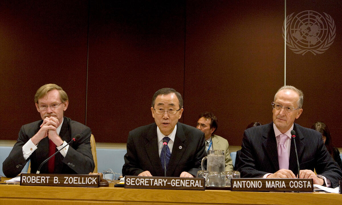 Secretary-General Ban Ki-moon (centre), flanked by Robert B. Zoellick (left), President of the World Bank; and Antonio Maria Costa, Executive Director of the United Nation Office on Drugs and Crime (UNODC), addresses the launch the Stolen Asset Recovery Initiative (StAR), intended to assist developing countries to recover their assets from corrupt leaders.