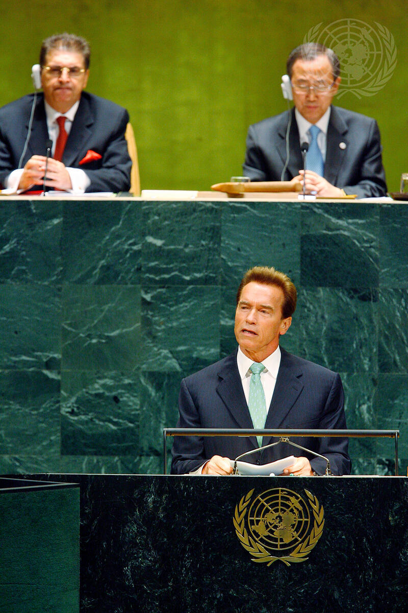 Arnold Schwarzenegger, Governor of California, addresses the High-Level meeting on Climate Change, at UN Headquarters in New York. Behind him on podium from left to right: Srgjan Kerim, President of the sixty-second session of the United Nations General Assembly, and Secretary-General Ban Ki-moon.