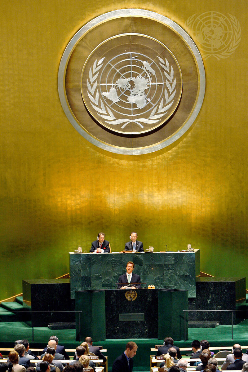 Arnold Schwarzenegger, Governor of California, addresses the High-Level meeting on Climate Change, at UN Headquarters in New York. Behind him on podium from left to right: Srgjan Kerim, President of the sixty-second session of the United Nations General Assembly, and Secretary-General Ban Ki-moon.