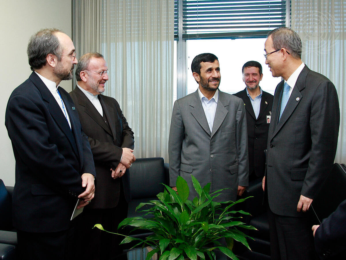 Secretary-General Ban Ki-moon (right) meets with Mahmoud Ahmadinejad (second from right, front row), President of the Islamic Republic of Iran; Manouchehr Mottaki (second from left), Minister for Foreign Affairs; and Javad Zarif, Permanent Representative of the Islamic Republic of Iran to the United Nations.