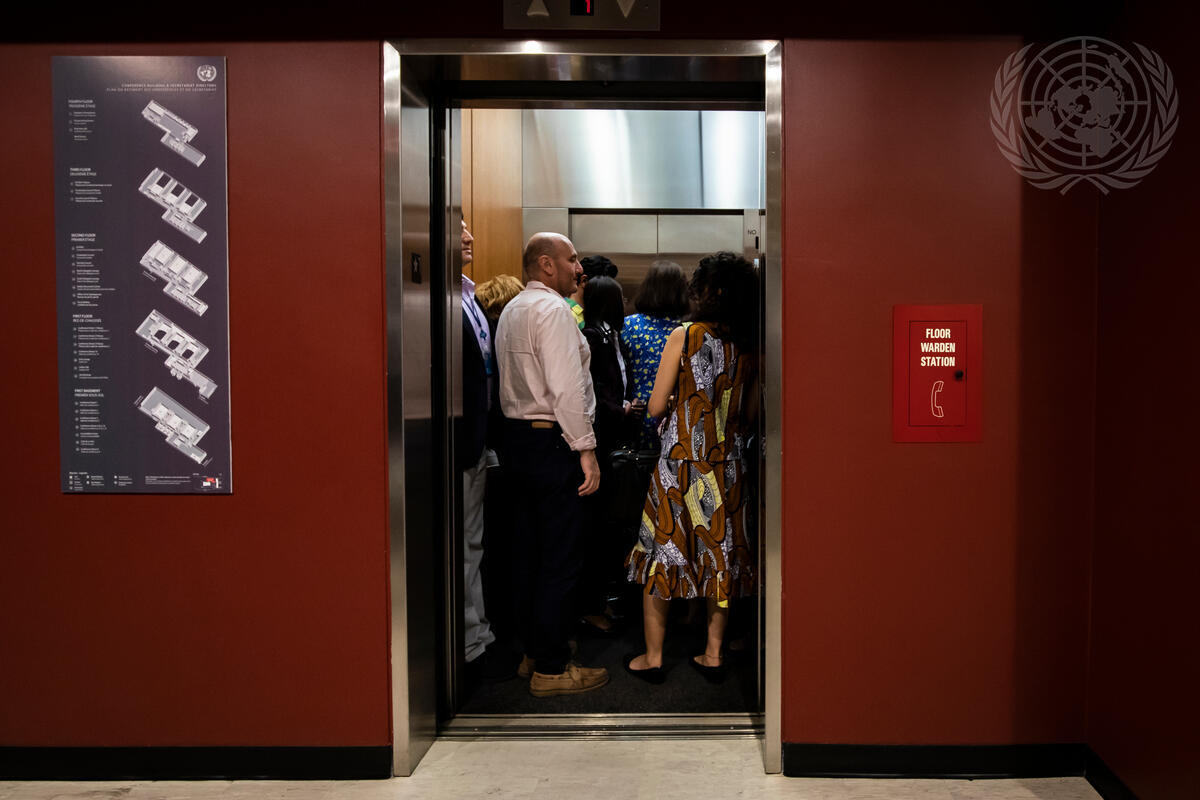 Participants of the UN Youth Climate Summit and UN Staff ride the elevator during the UN Youth Climate Summit.