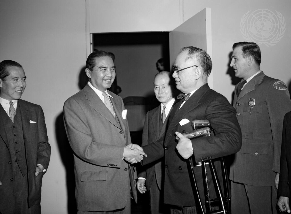 Mr. Mamoru Shigemitsu (right), Deputy Prime Minister and Minister of Japan, being welcomed by Prince Wan Waithayakon, of Thailand, President of the eleventh session of the General Assembly, upon arrival at U.N. Headquarters.