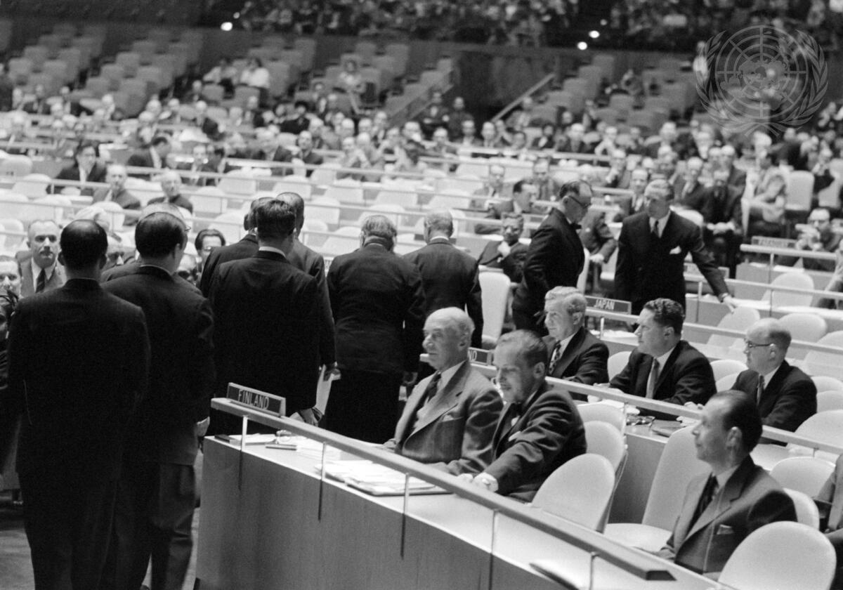 Here Mr. Jehan De Noue, Chief of Protocol of the United Nations, is shown seating the members of Japan's Delegation.