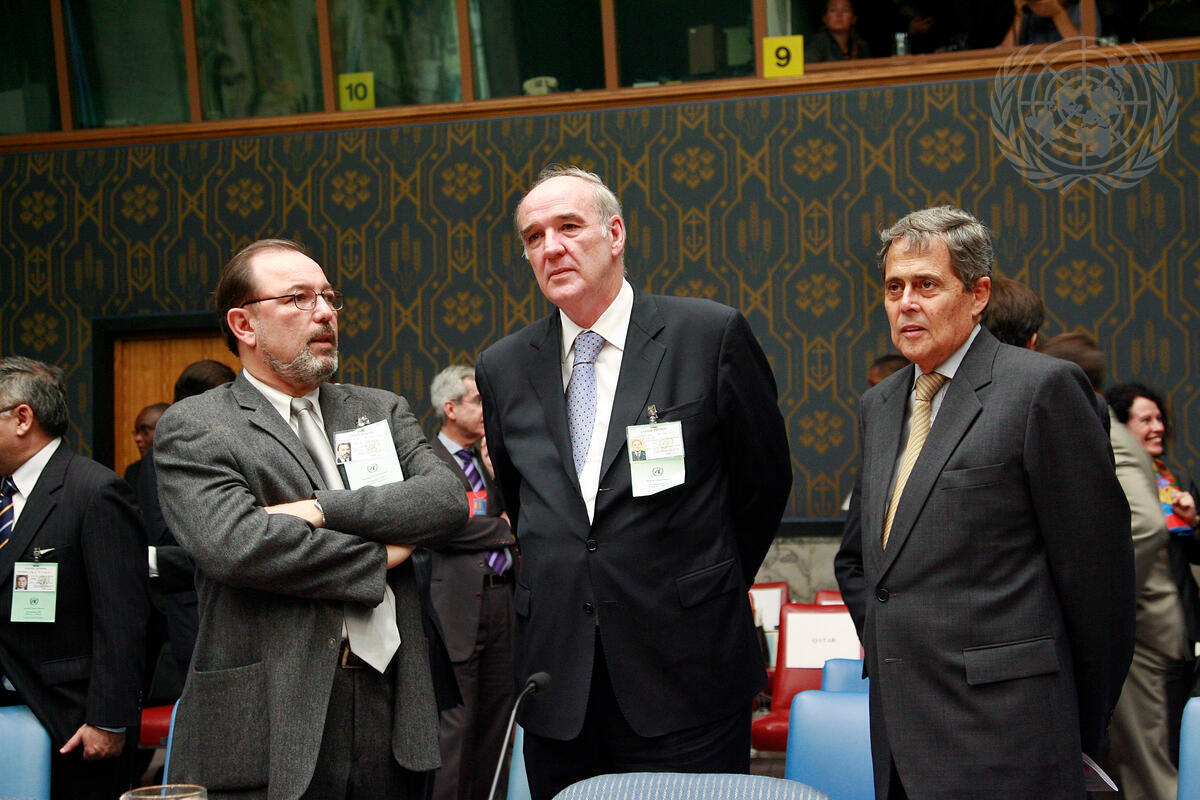 Ruben Blades (left), Minister of Tourism of Panama; Antonio García Belaunde (centre), Minister for Foreign Affairs of Peru; and Jorge Voto-Bernales, Permanent Representative of Peru to the United Nations, attend a High-Level meeting of the Security Council on Peace and Security in Africa, at UN Headquarters in New York.