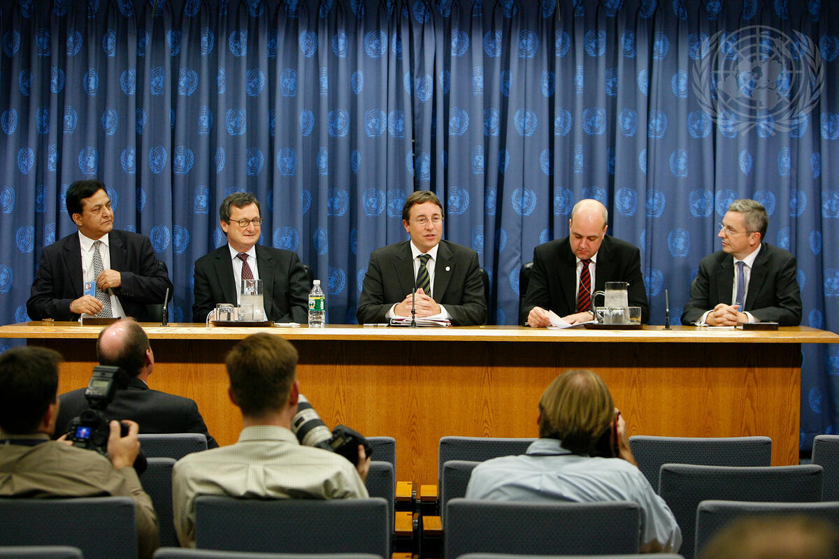Achim Steiner (centre), E xecutive Director of the United Nations Environment Programme (UNEP), joined by Rana Kapoor (left), Managing Director and Chief Executive Officer of Yes Bank in India; Mark Goldfus (second from left), Head of Public Policy of Merrill Lynch; Fredrik Reinfeldt (second from right), Prime Minister of Sweden; and James Cameron, Chairman of Carbon Disclosure Project (CDP), briefs correspondents on the release of a new survey by the Carbon Disclosure Project, at UN Headquarters in New York.