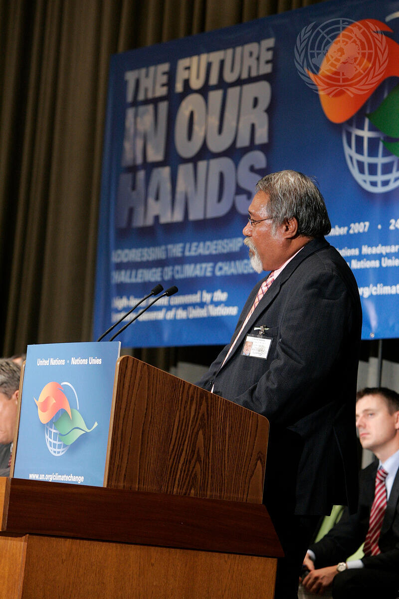 Tavan Teii (right, at podium), Deputy Prime Minister and Minister of Natural Resources and the Environment of Tuvalu, addresses the thematic plenary meeting on ""Financing the response to climate change - investing in tomorrow"", at UN Headquarters in New York.