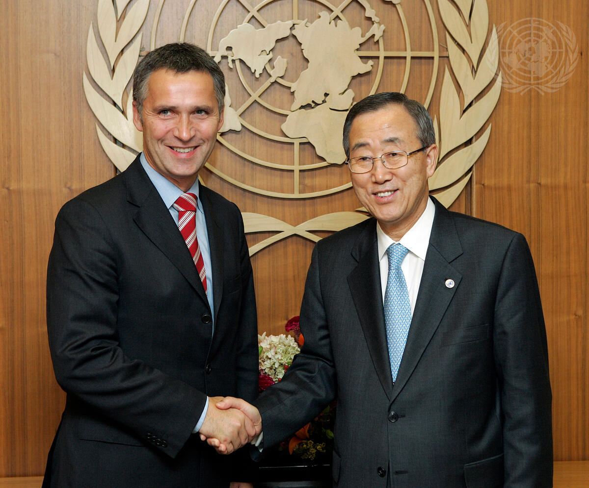 Secretary-General Ban Ki-moon (right) meets with Jens Stoltenberg, Prime Minister of Norway.