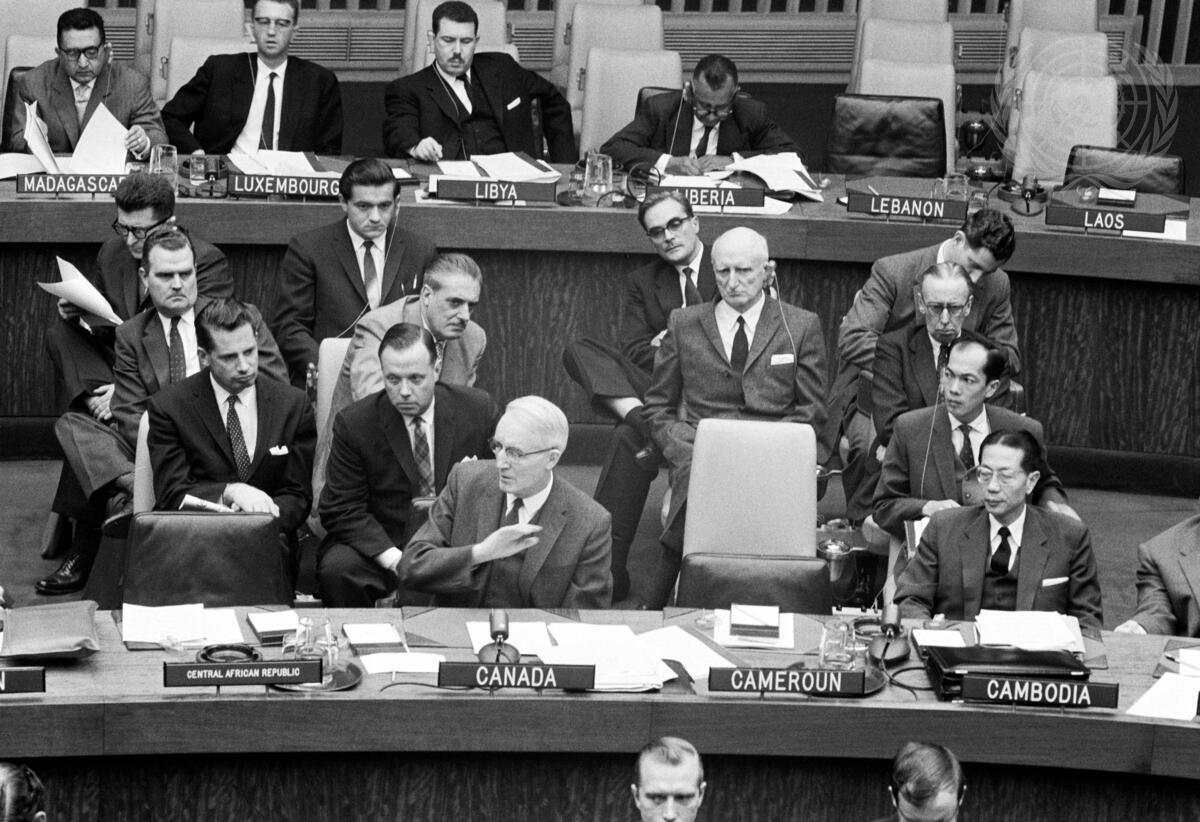 The UN General Assembly's First (Political and Security) Committee today began the debate on the question of disarmament. The Hon. Howard C. Green (front row), Canada's Secretary of State for External Affairs, addressing the afternoon meeting.