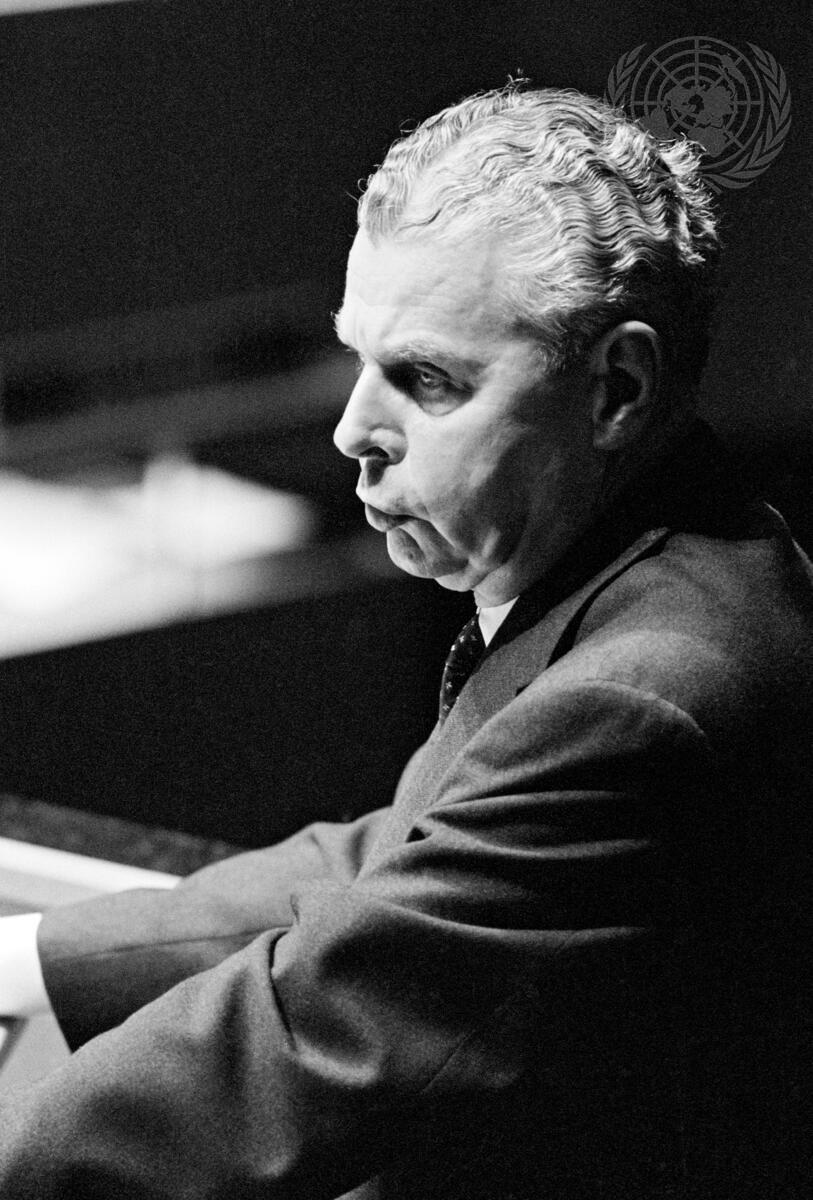 The General Assembly continued general debate today. An unprecedented number of high officials are attending this session which has before it an 87-item provisional agenda, the longest in its history. Seen here as he addressed this morning's plenary meeting of the Assembly is Prime Minister John Diefenbaker, of Canada.