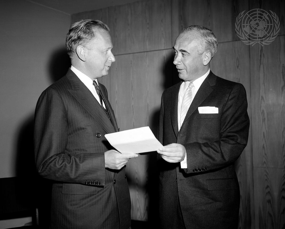 Ambassador Jose A. Correa, Ecuador new Permanent Representative to the United Nations, is seen here (right) as he presents his credentials to U.N. Secretary-General Dag Hammarskjöld.