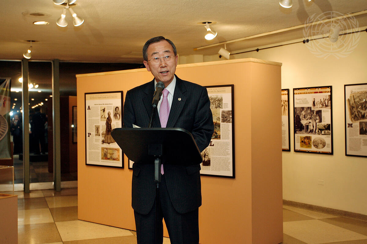 Secretary-General Ban Ki-moon speaks at the opening of an exhibition entitled ""Lest We Forget - The Triumph Over Slavery"", in commemoration of the 200th Anniversary of the Abolition of the Trans-Atlantic Slave Trade, at UN Headquarters in New York.