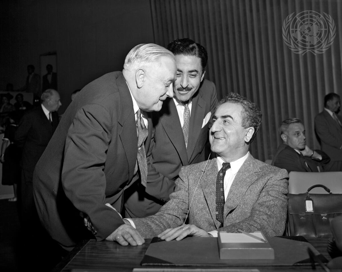 Senator Alexander Wiley (left), Representative of the United States, shakes hands with Mr. Charles Malik, Delegate of Lebanon, as Mr. Karim Azkoul, Lebanon's Acting Permanent Representative to the United Nations, looks on.