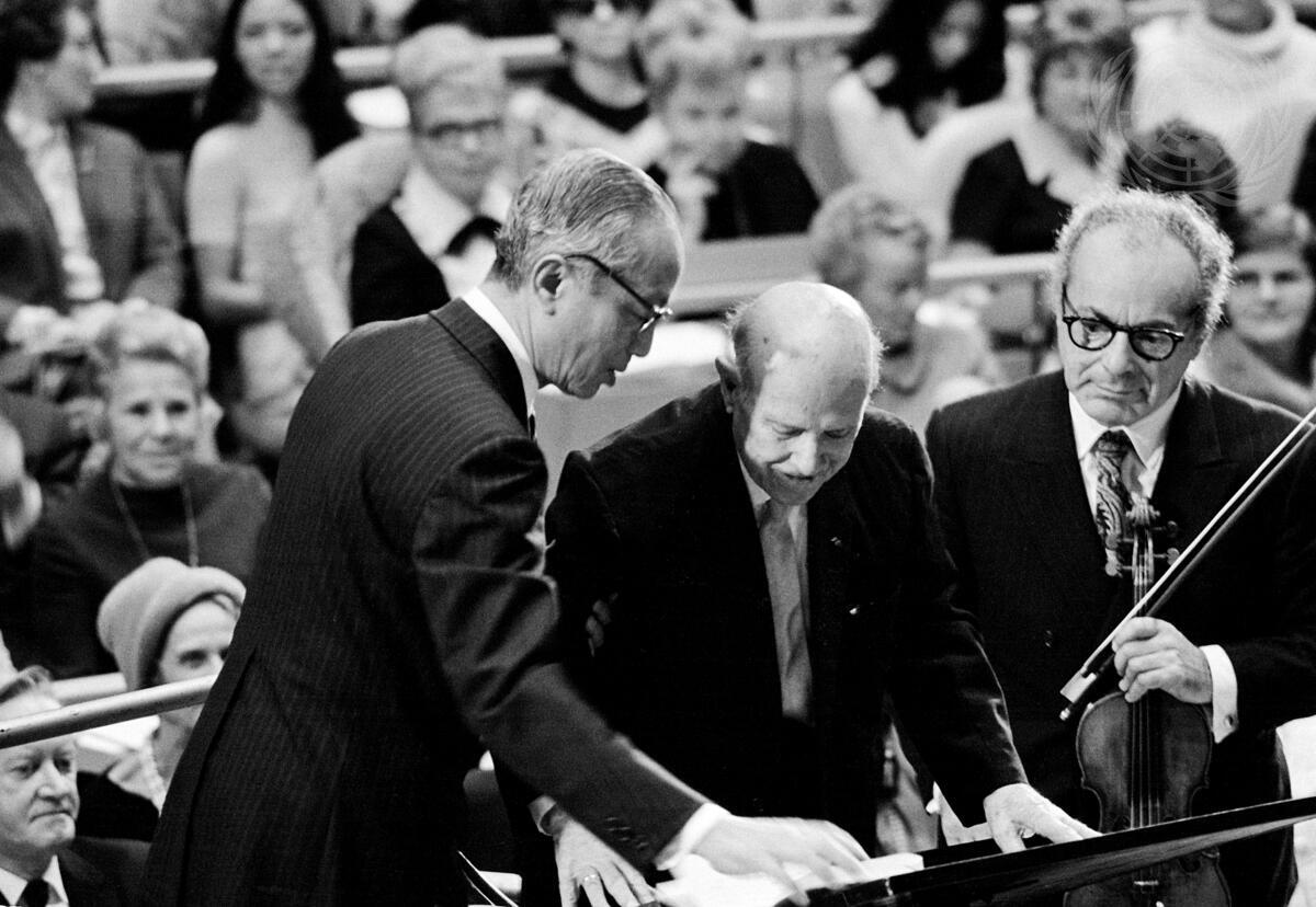 UN Secretary-General U Thant is seen as he is about to leave the conductor's stand following his address and presentation of the United Nations Peace Medal to Maestro Pablo Casals (centre). At the right is Alexander Schneider.