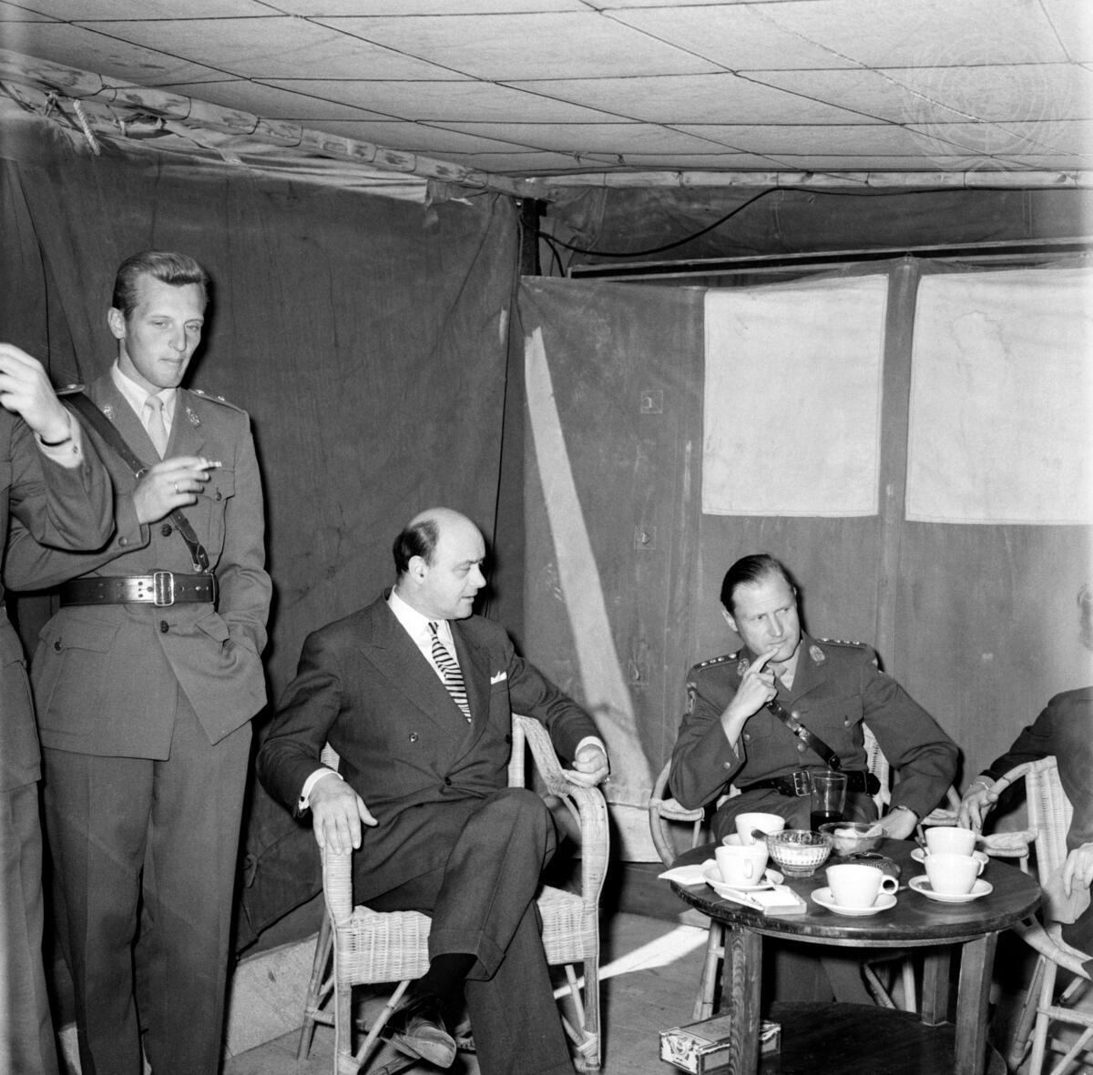 Ambassador Eggert (seated at left) is seen at tea with Major S.A. Iversen. Standing at left is Lt. K. H. Petersen.