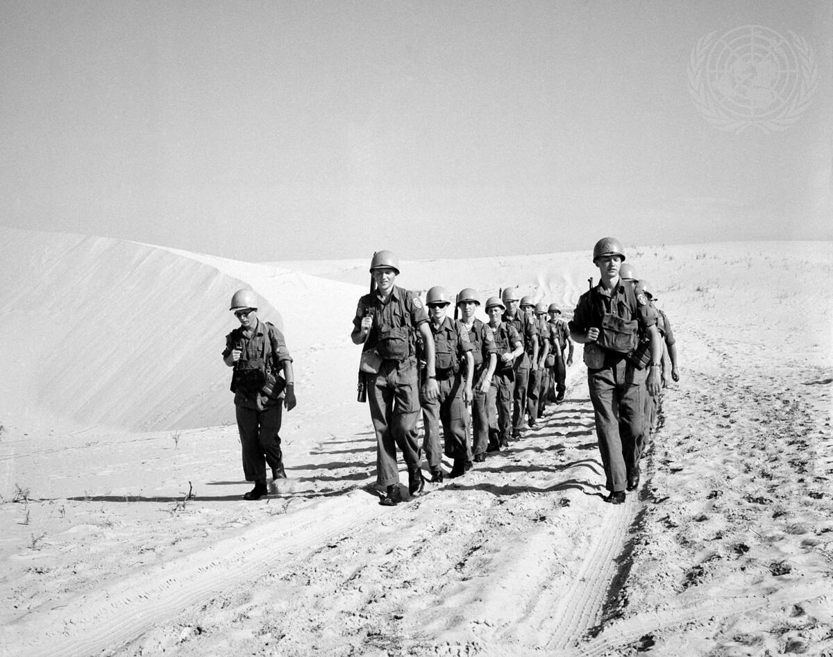 A platoon of the Danor (Danish-Norwegian) battalion of UNEF moving out into the desert from a Company camp to patrol along the Armistice Demarcation Line.