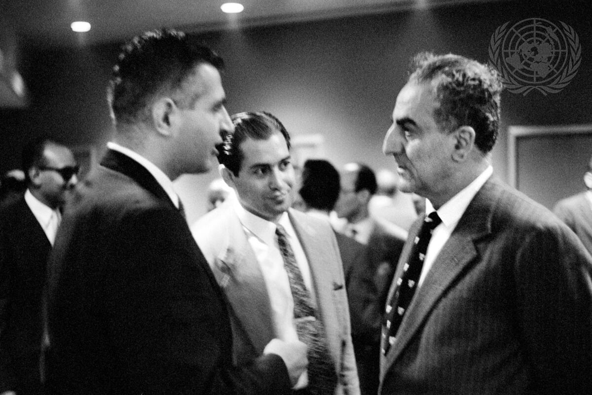 Shortly before the opening of the afternoon meeting, Dr. Charles Malik, Lebanon's Minister for Foreign Affairs, is (right) exchanging views with two members of the Arab Students Organization in the United States.