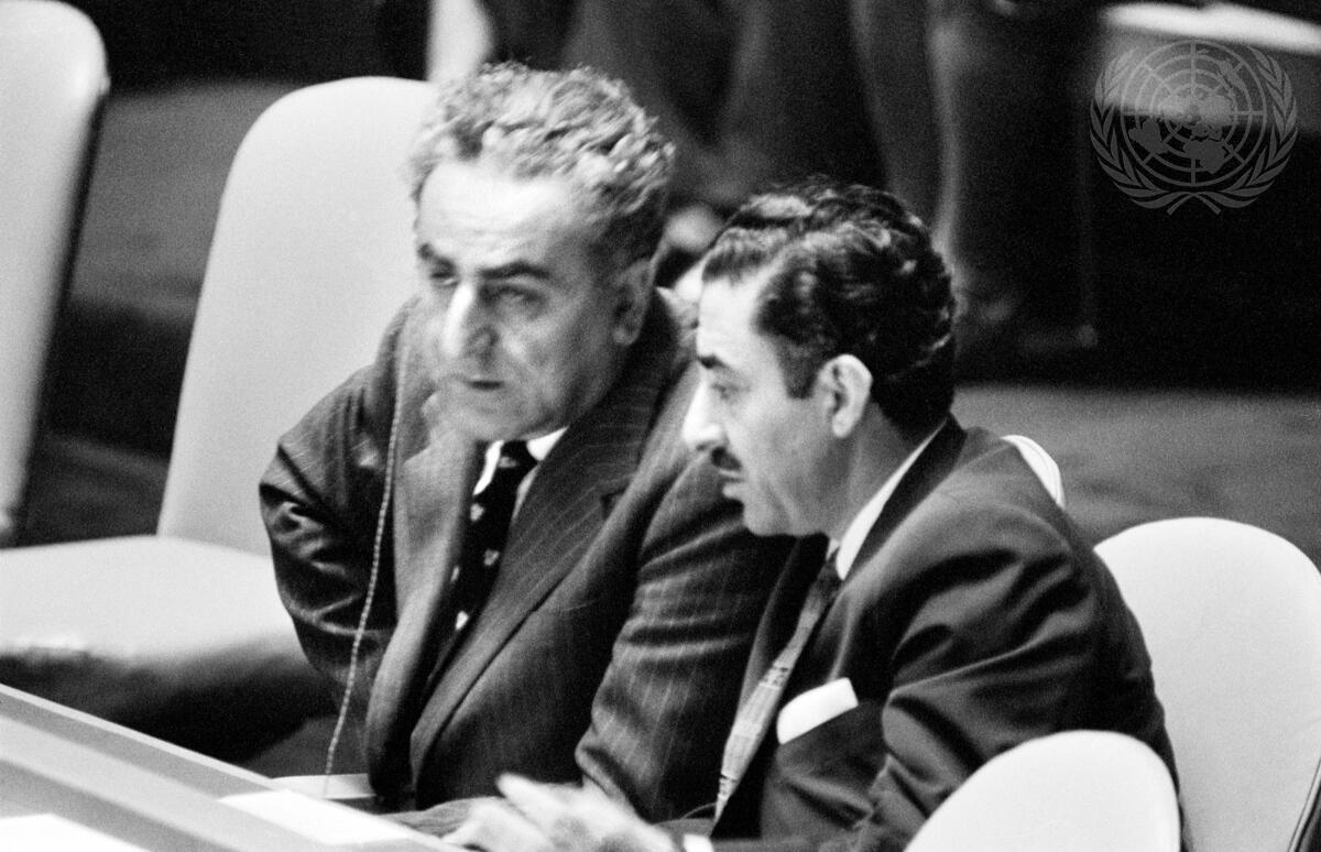 Dr. Charles Malik, Lebanon's Minister for Foreign Affairs (left) is exchanging views with Dr. Karim Azkoul, Permanent Representative of Lebanon to the UN, shortly before the opening of the morning meeting of the Assembly.