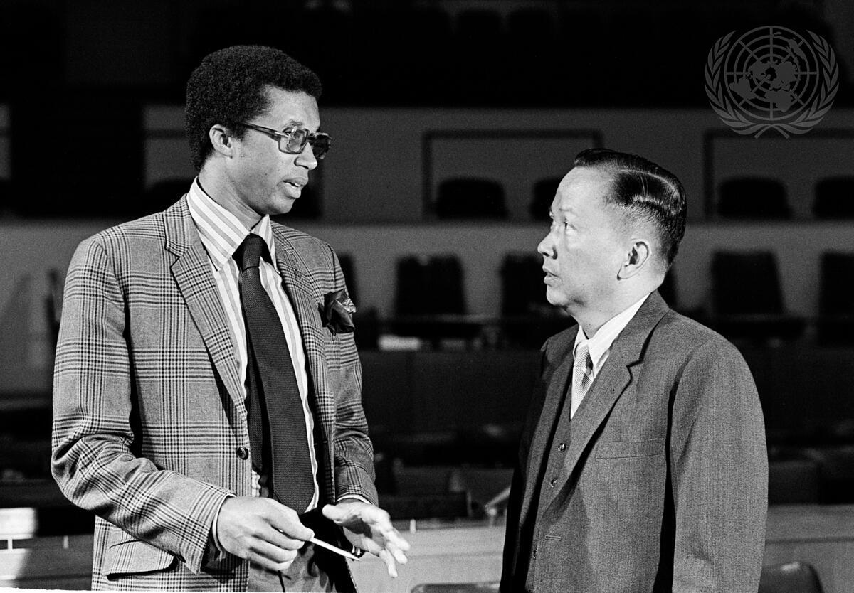 Arthur Ashe (left) conversing with Privado G. Jimenez (Philippines), Acting Chairman of the Special Committee.