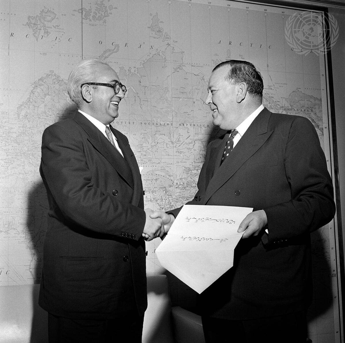 Ambassador Mohammed Kabir Ludin (left) is the new Permanent Representative of Afghanistan to the United Nations. He is seen here with UN Secretary-General Trygve Lie, after presenting his credentials.