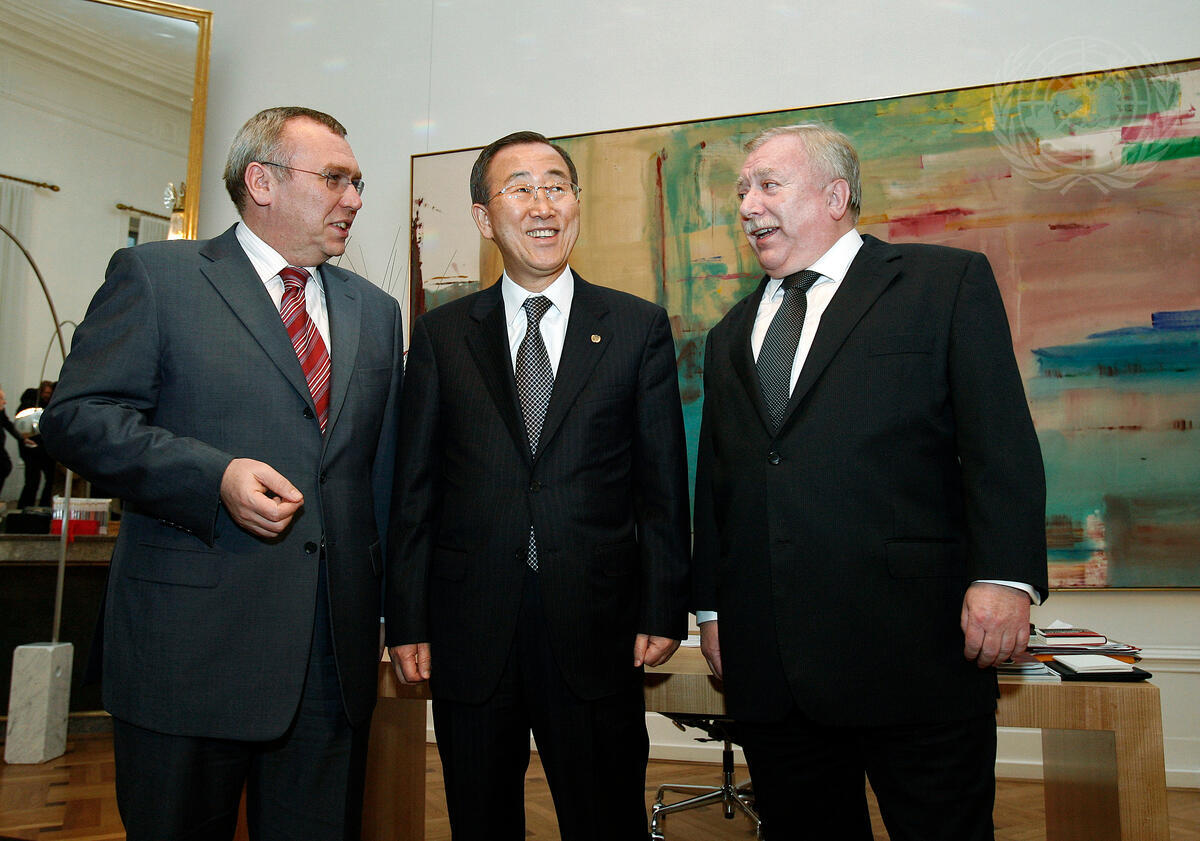 Secretary-General Ban Ki-moon (centre) is greeted by the Chancellor of the Republic of Austria, Alfred Gusenbauer (left) in the Federal Chancellery, in Vienna, Austria.