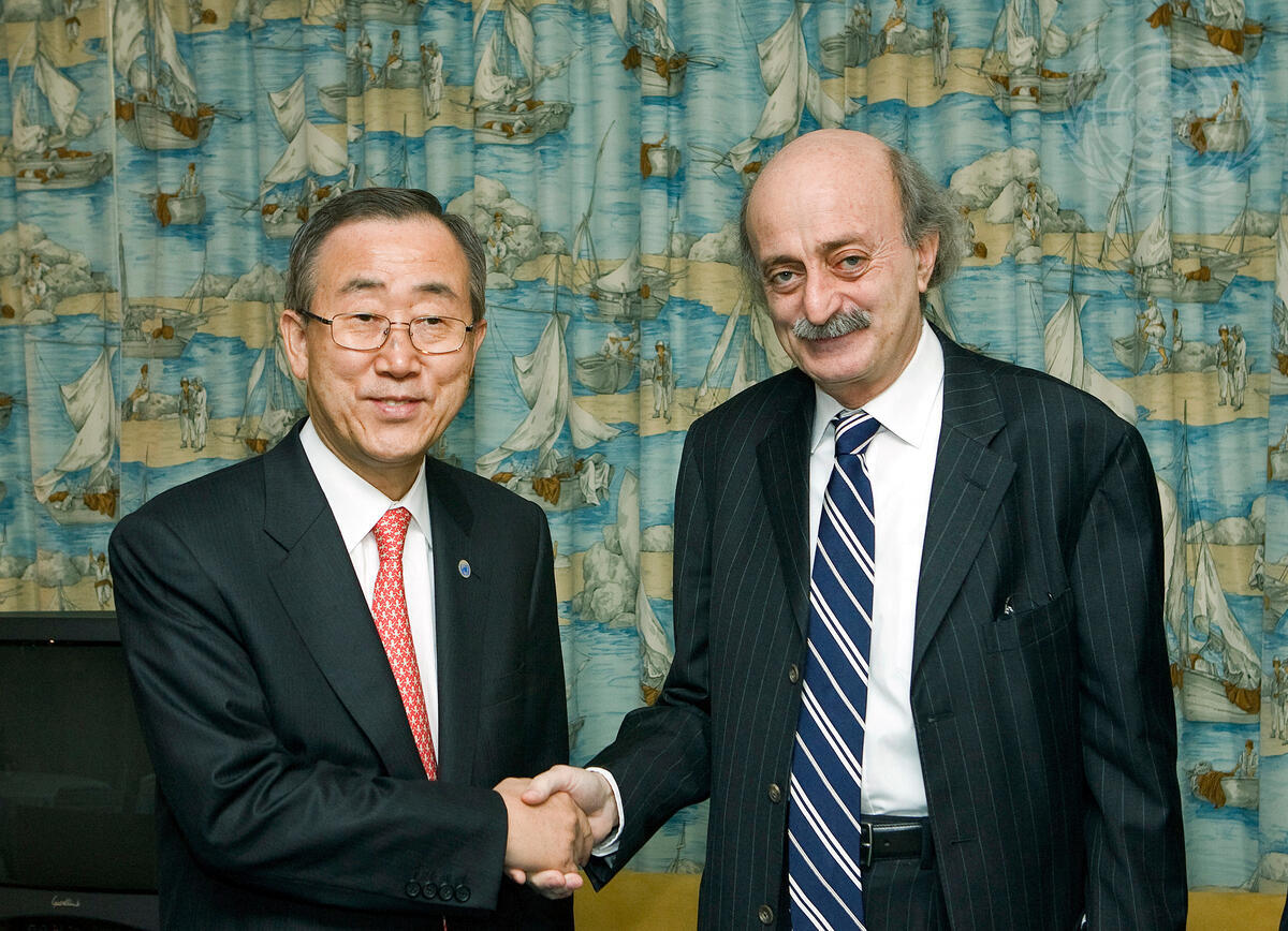 Secretary-General Ban Ki-moon (left) meets with Walid Jumblatt, Leader of the Progressive Socialist Party of Lebanon, and the most prominent leader of the Druze.