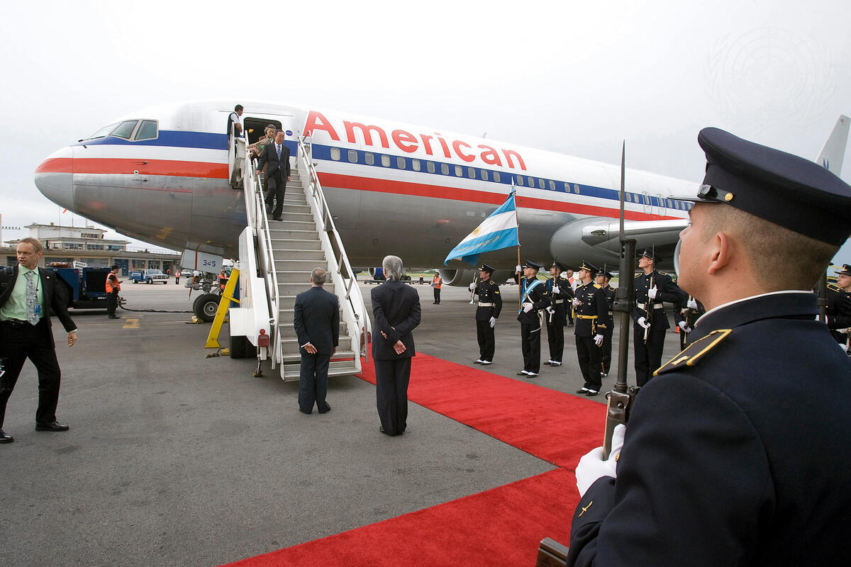 Secretary-General Ban Ki-moon and his wife Yoo Soon-taek arrive in Buenos Aires.