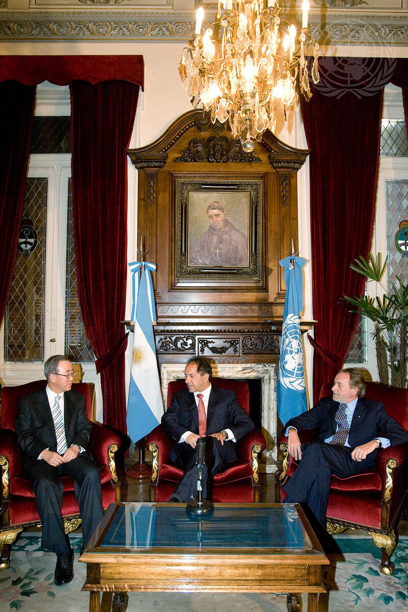 Secretary-General Ban Ki-moon (left) in a meeting with Daniel Scioli (centre), President of the Senate, and Alberto Balestrini, President of the House of Representatives, during a formal visit to the National Congress.