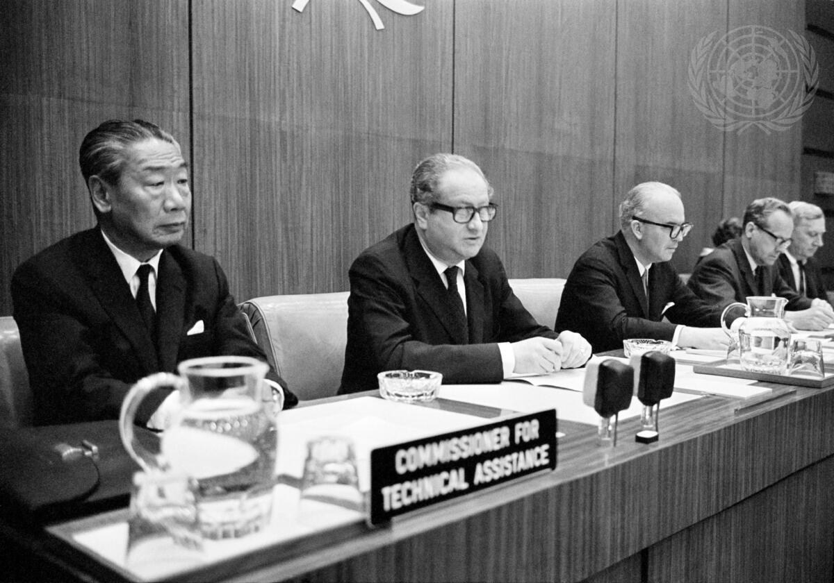(Left to right) Victor Hoo, Commissioner for Technical Assistance, Mr. Bruno Kreisky, Foreign Minister of Austria, Mr. David Owen, Executive Chairman of the Technical Assistance Board, Dr. Sigvard Eklund, Director-General of the International Atomic Energy Agency, and Mr. Charles Hogan, UN Committee Secretary.