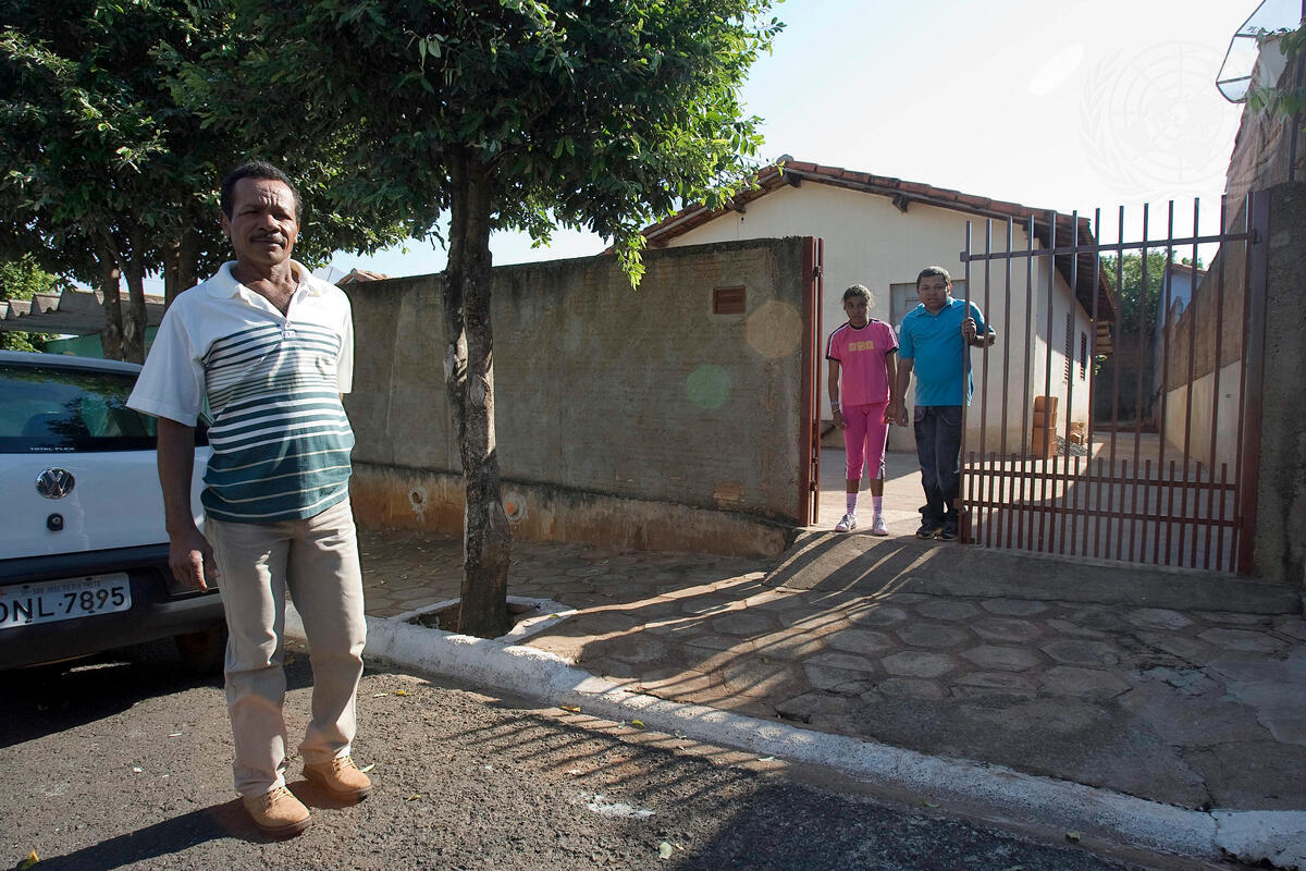 Severino Ramos de Andrade, an employee of the Moema Mills sugar cane company in front of his house with his children standing at the gate. Like many other employees of the company he worries about loosing his job and eventually his good standard of living due to automation at the Mill.