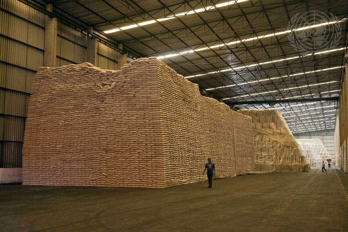 A stack of bags of sugar for consumption stored at the Moema Mills sugar warehouse in Brazil.