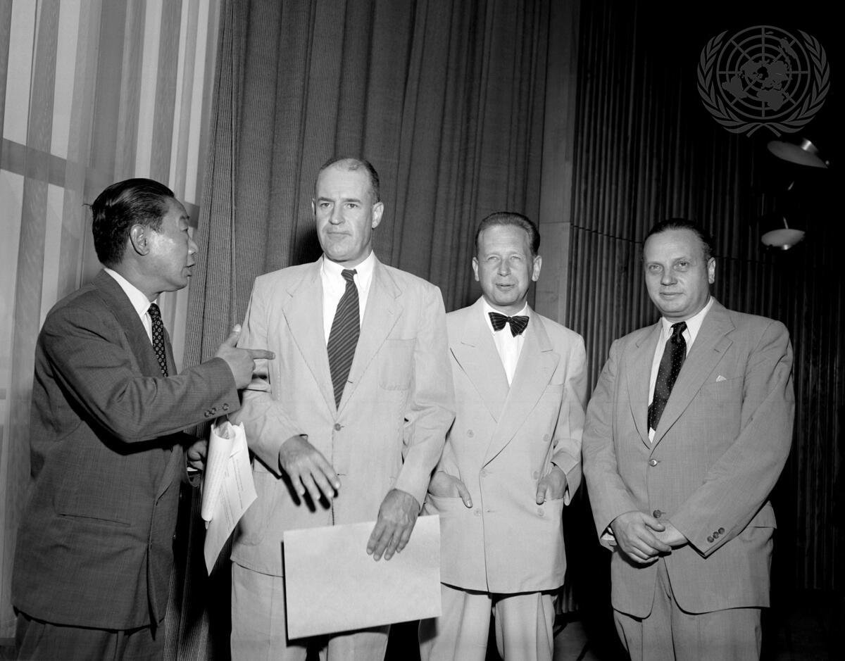 From left to right, before the opening meeting of the twelfth session of the Trusteeship Council: Mr. Victor Hoo, Assistant Secretary-General of the U.N. in charge of Trusteeship and Information from Non-Self-Governing Territories; Mr. Mason Sears, new representative of the United States on the Council; United Nations Secretary-General Dag Hammarskjöld; and Mr. Leon Pignon, representative of France.