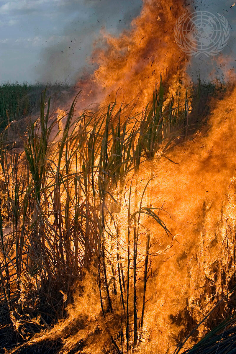 A view of sugar cane field burning prior to harvesting to make the cutting easier and to reduce the cost.
