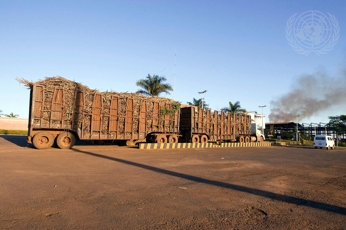 A transport truck delivers sugar cane from the fields to the Moema Mill sugar cane company.