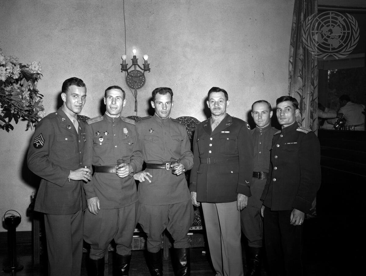 Reception for all officers at the Conference given by Major General Pratt, Commanding General of the Western Defense Command, at the Presidio, May 22. Group of Russian and American officers and soldiers.