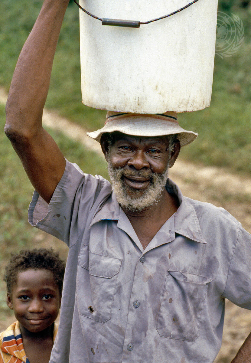 Man carrying water home from river in Cave Valley, Jamaica. Rivers are one of the main sources of usable water. [No exact date]